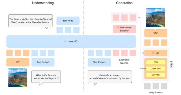 架构图,OpenUni 架构:通过 256 个可学习查询和 6 层轻量连接器,GenEval 达到 0.84 分,桥接冻结的 InternVL(理解)与 SANA(生成)